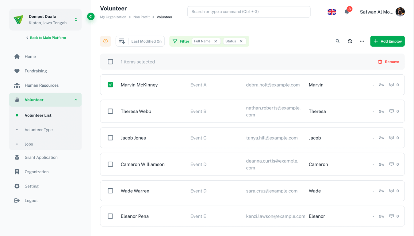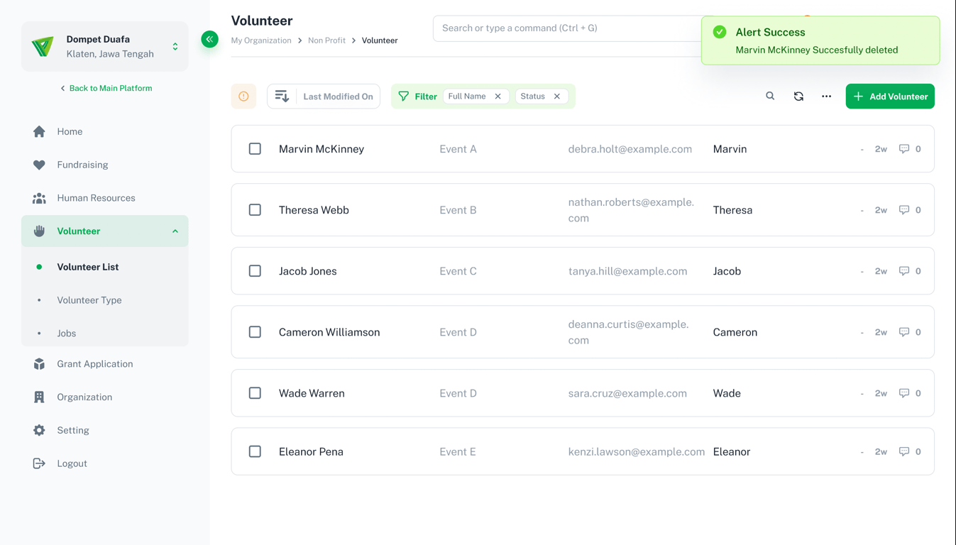 If there's particular volunteers are no longer working with your organization, you can deleted them from the list.