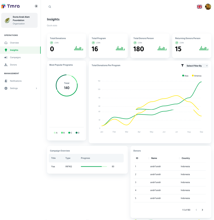 - Total Donation Per Program: Amount of total donors for each of your campaign. You can filter it based on Monthly, Quarterly and Yearly